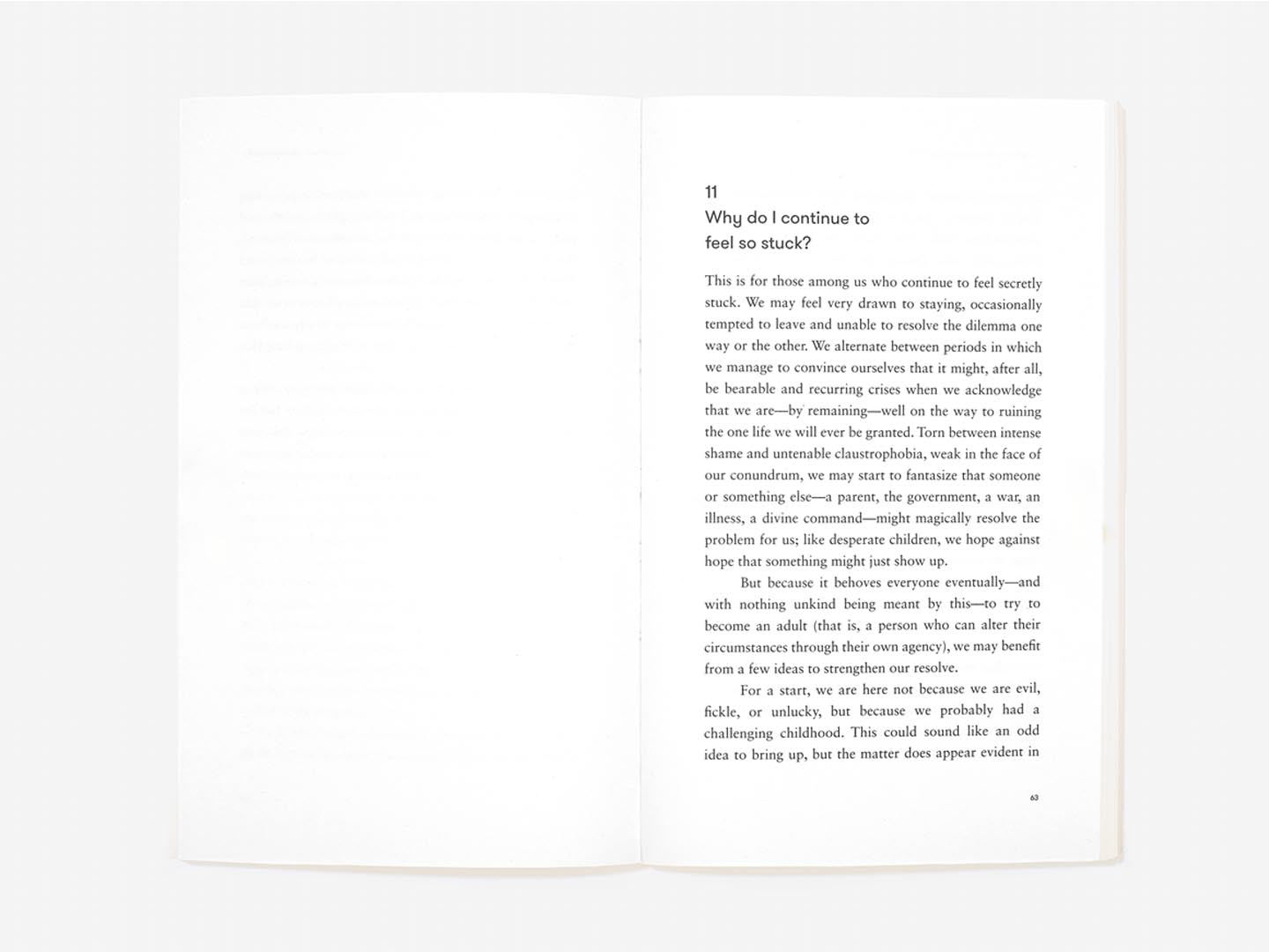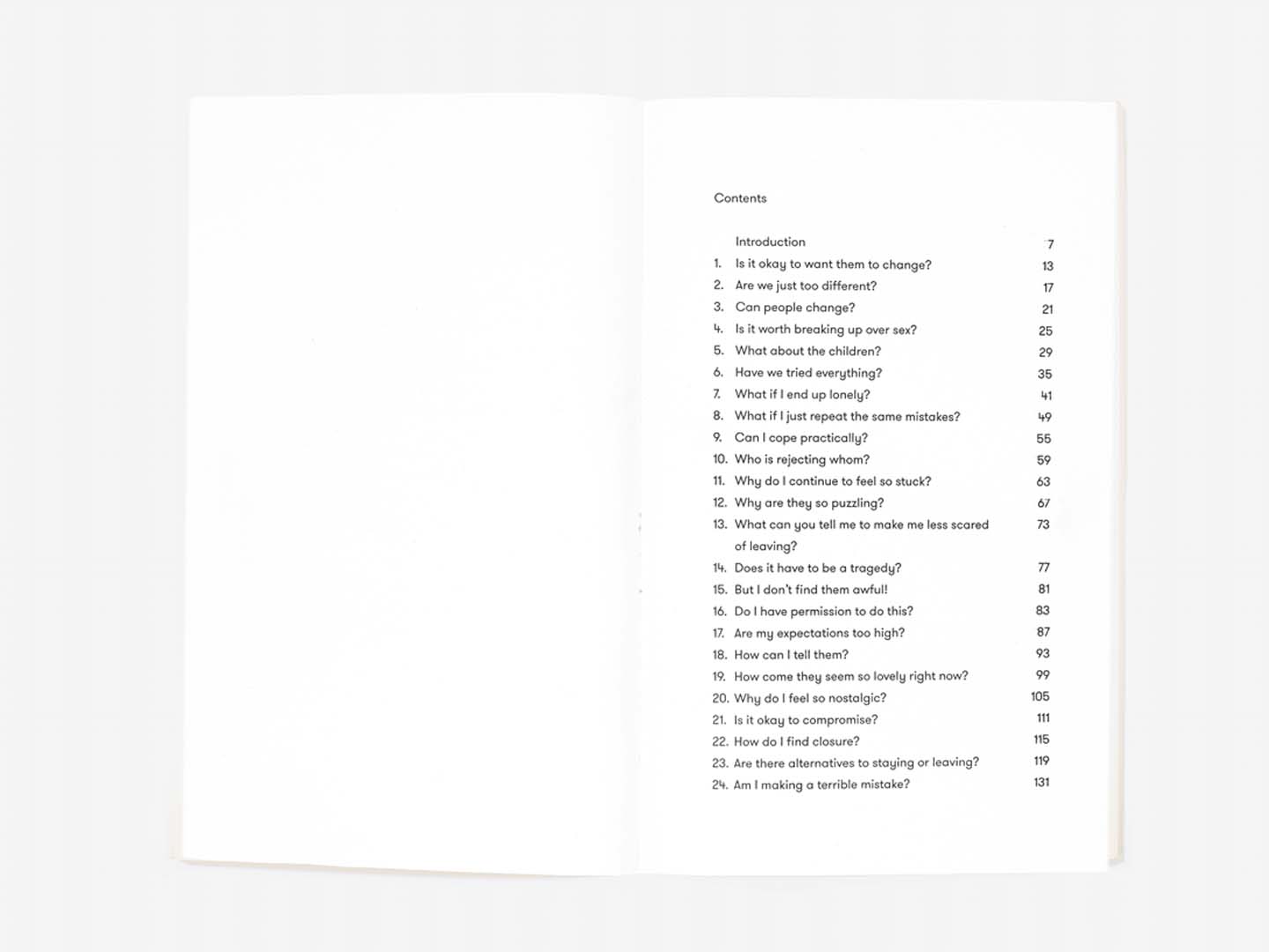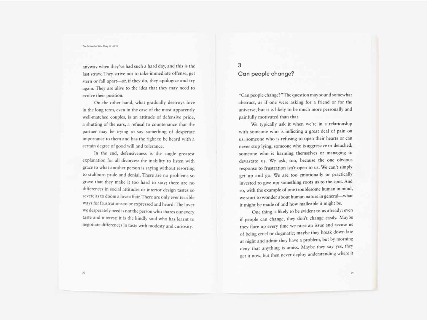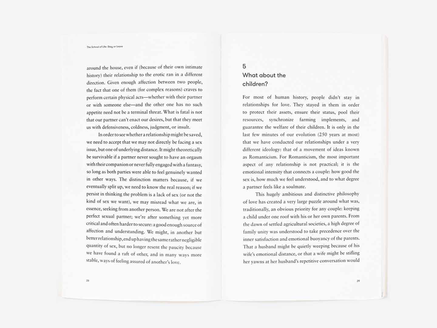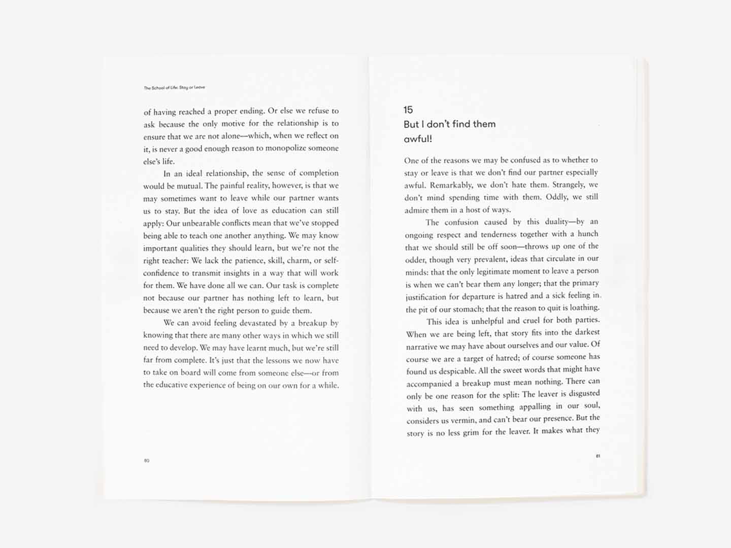 Whether we should stay in or leave a relationship is one of the most consequential and painful decisions we are ever likely to confront: few other issues will have such power to trouble us. What makes the issue so hard is that there are no fixed rules for judgement. How can we tell whether a relationship is ‘good enough’ or plain wrong? How do we draw the line between justified longing and naivety? Is sex vital or could it be foregone? Does someone ‘better’ actually exist? How much should the feelings of children be counted (and what might they be in the long term)? Could one’s partner change, perhaps with therapy, or should one assume that who they are now is who they will always be?